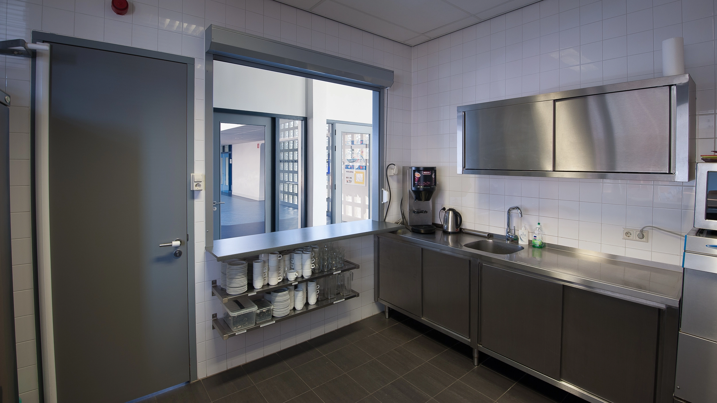 Indien u een zaal huurt, kan het handig zijn om ook gebruik te maken van de keuken. De keuken heeft een uitgiftebalie aan de kant van de Kerkzaal en een uitgiftebalie naar Zaal 1.